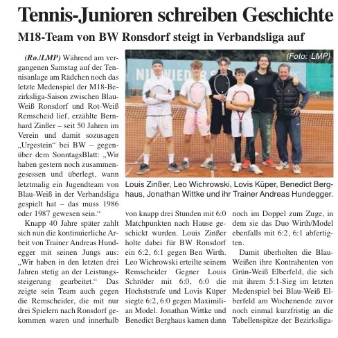 Das hat wahrlich eine historische Dimension, denn nach Jahrzehnten der Abstinenz steigt das Team der U18-Junioren von Blau-Weiss Ronsdorf dank einer geschlossenen Mannschaftsleistung wieder in die Verbandsliga auf. Jonathan Wittke, Louis ZinĂer, Leo Wichrowski, Lovis KĂŒper und Benedict Berghaus verwiesen mit 7:1 Punkten, 18:6 Matsches und 39:14 SĂ€tzen die Nachbarn von GrĂŒn-Weiss Elberfeld auf den zweiten Platz. Im direkten Vergleich gab es ein verdientes Unentschieden. Trainer Andreas Hundegger sieht sich in seinem Konzept bestĂ€tigt, mit dem er seit drei Jahren kontinuierlich an der Leistungssteigerung arbeitet.